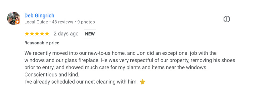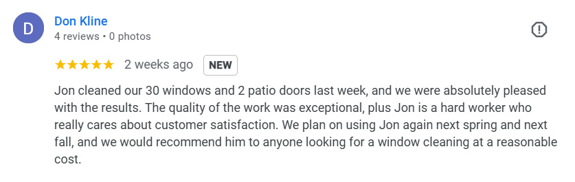 Welcome to Spirit Window Cleaning, I'm Jon Sears, sole owner and operator. Every home & commercial space is treated with the care as if it were my own; no rushed crews, no shortcuts. Each pane is cleaned by hand, the old-fashioned way with a scrubber and squeegee, to ensure no spots or drips are left behind. With this method, I can guarantee your windows won't just be clean, they'll look brand new.