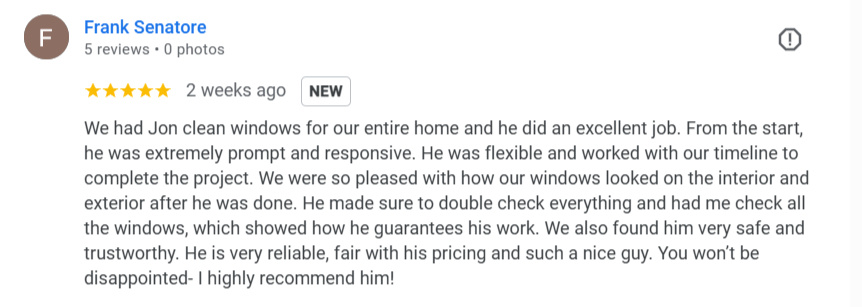 Welcome to Spirit Window Cleaning, I'm Jon Sears, sole owner and operator. Every home & commercial space is treated with the care as if it were my own; no rushed crews, no shortcuts. Each pane is cleaned by hand, the old-fashioned way with a scrubber and squeegee, to ensure no spots or drips are left behind. With this method, I can guarantee your windows won't just be clean, they'll look brand new.